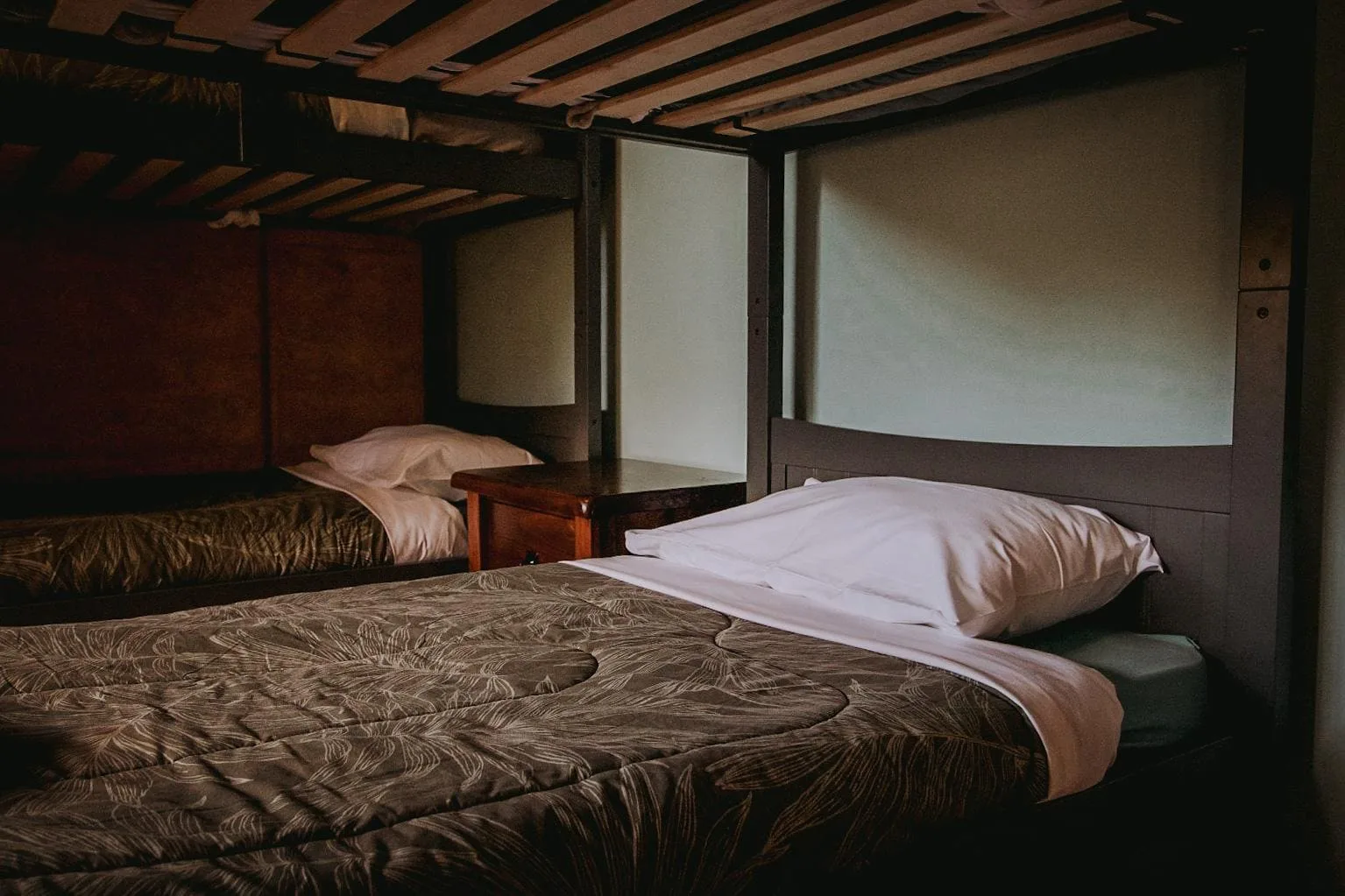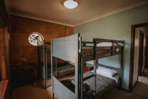 There is one ensuite king bed, one queen bed, four bunk beds and a total of two bathrooms.
